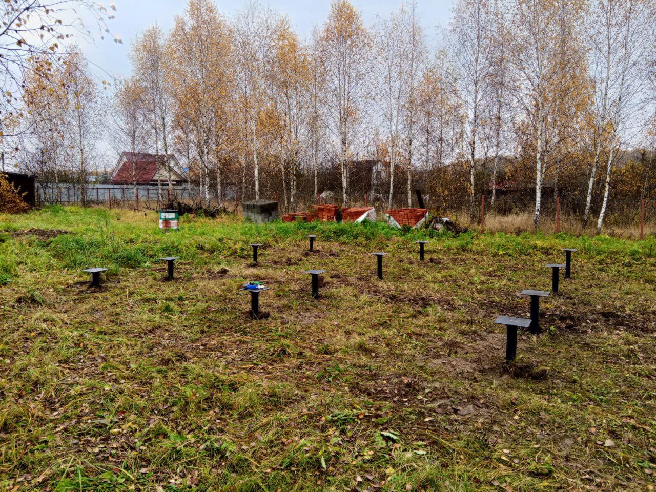 2. Монтаж свай: Далее последовало вкручивание всех двенадцати винтовых свай в грунт. Монтаж проводился с применением специализированного оборудования, что гарантирует правильное и плотное вхождение сваи в несущие слои грунта.