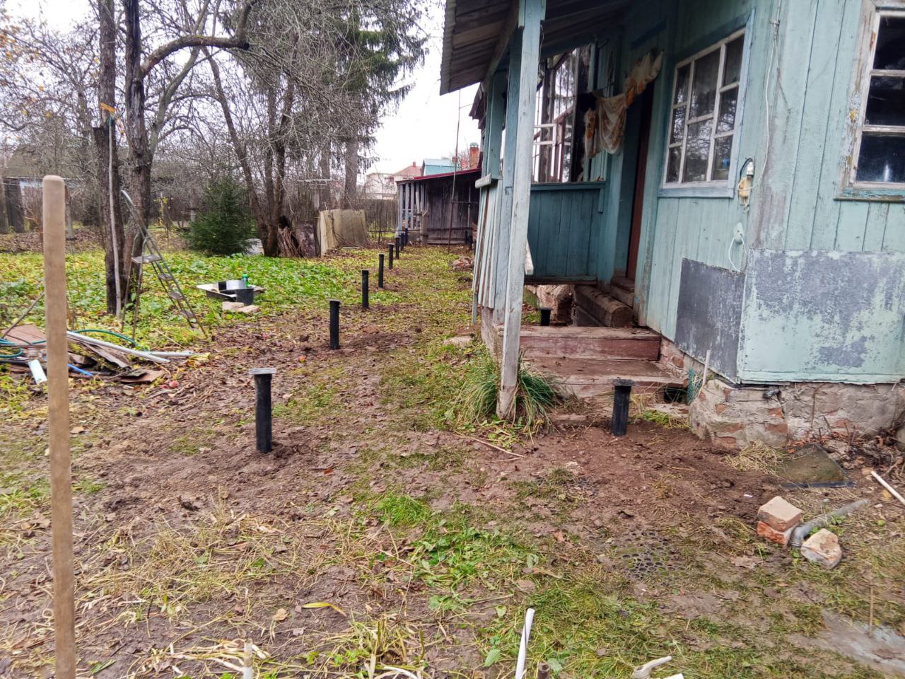 В назначенный день наша бригада прибыла на объект. Первым делом была выполнена точная разметка свайного поля. Согласно проекту, мы расположили сваи в два идеально ровных ряда. Первый ряд прошел в непосредственной близости к стене бревенчатого дома, а второй ряд определил внешний край будущей террасы, задавая ее ширину.